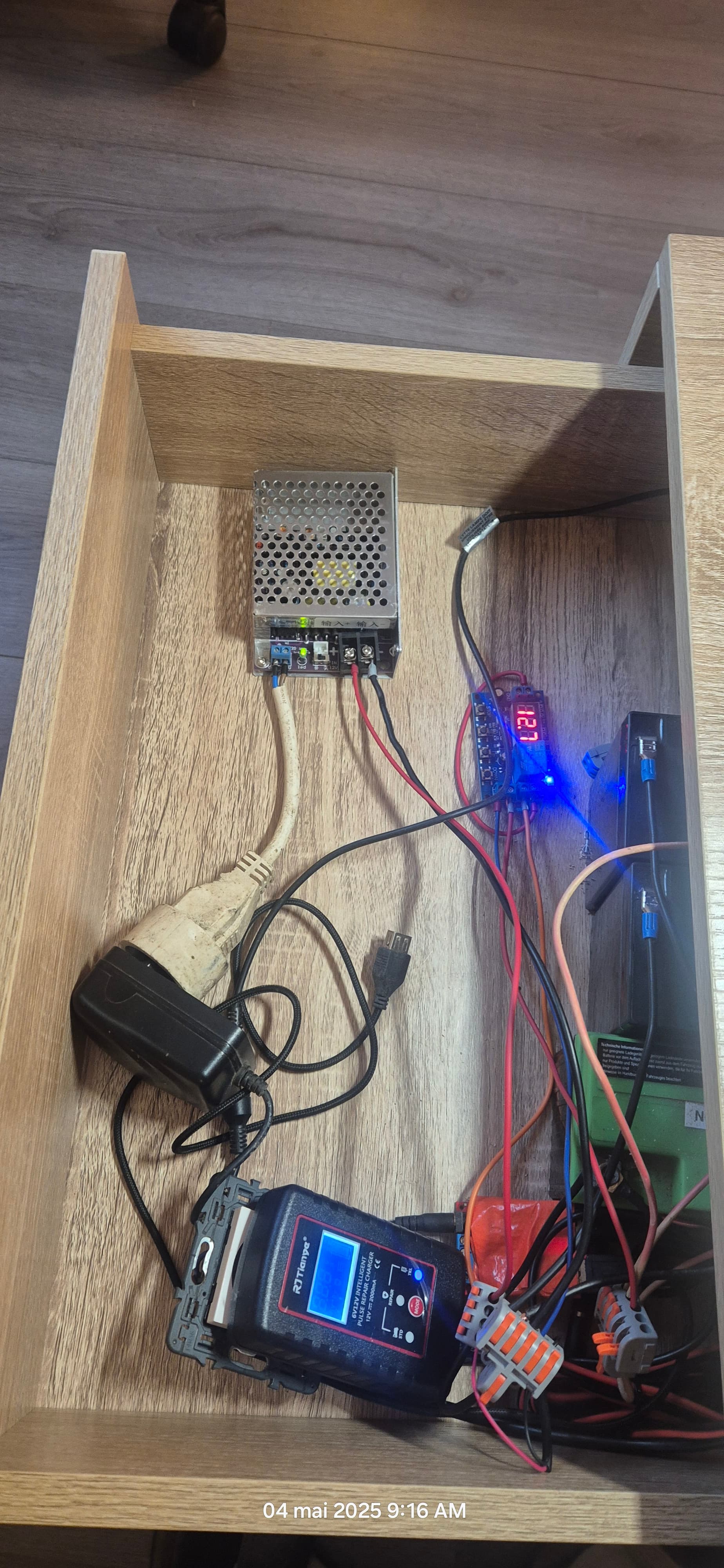 Comme j’ai plus d’ecran pour tester l’onduleur j’utilise une lampe de bureau avec chargeur QI… dont je viens de m’apercevoir qu’elle peut fonctionner en 12v