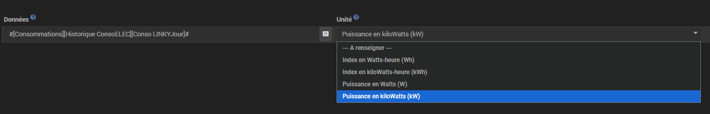 Si tu saisis une donnée en kWh en entrée il ne faut pas indiquer une unité de puissance en kW. Le plugin détecte automatiquement l’unité pourtant.