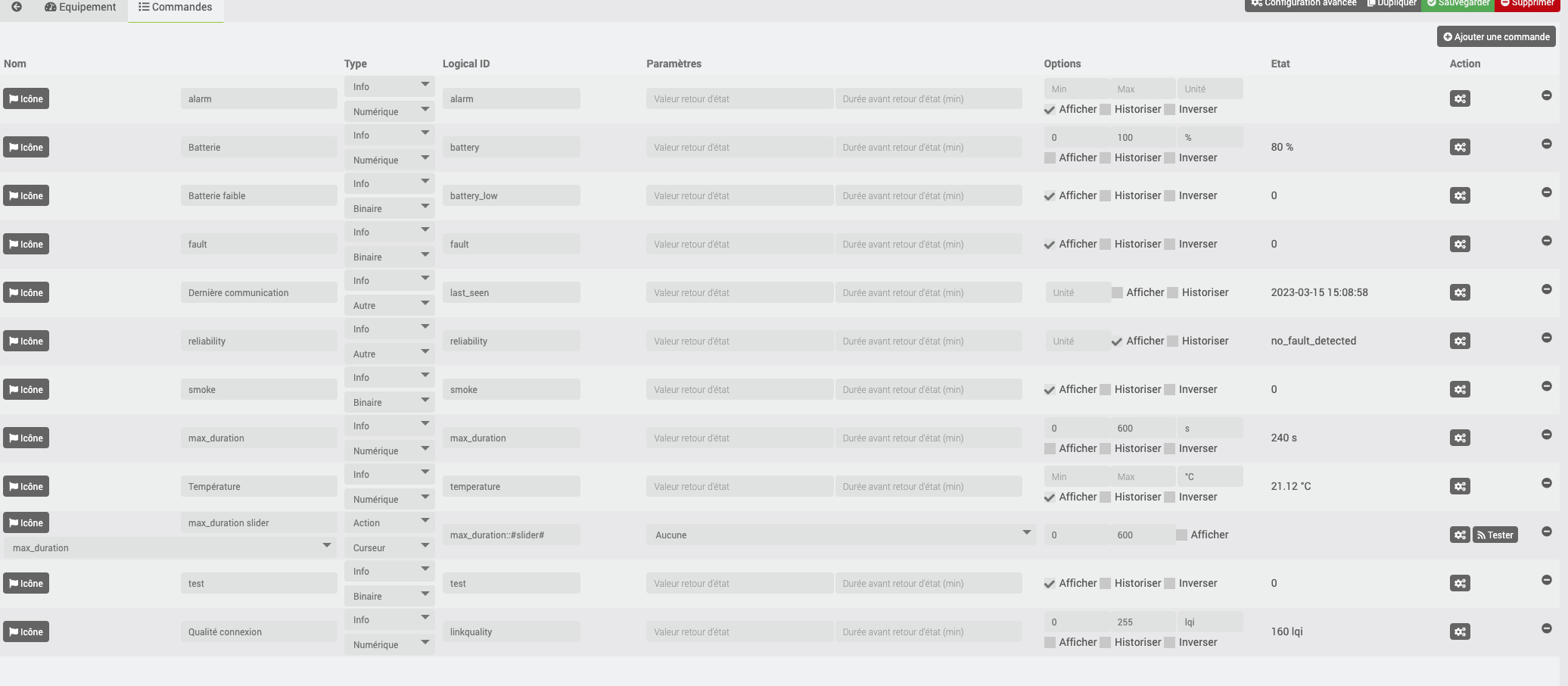 voici les informations brutes dans jeedom
