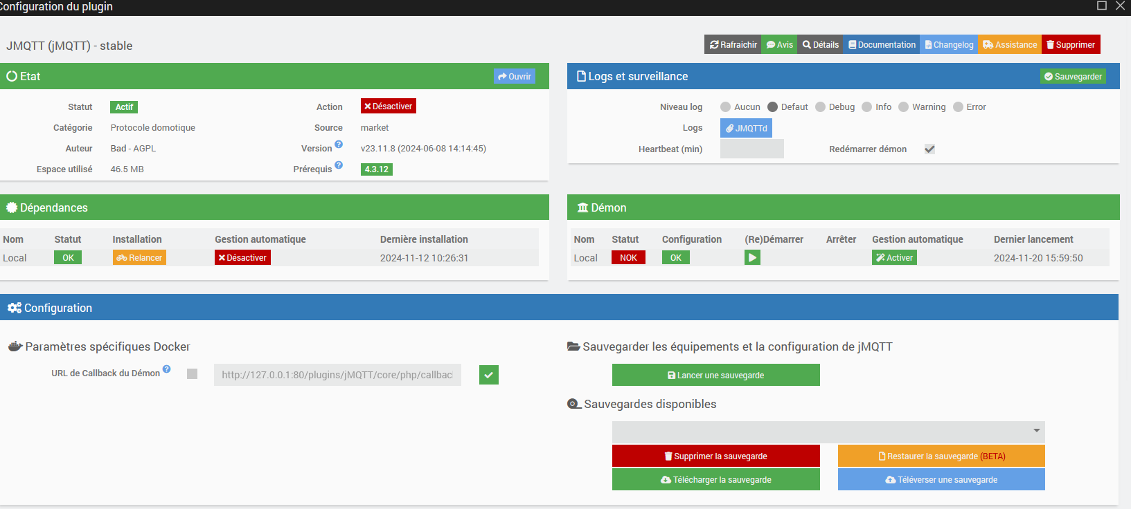 il y a quelque jour j’avais posté un problème de non démarrage du demon pour le plugin au reboot et au relancement de jeedom par docker.