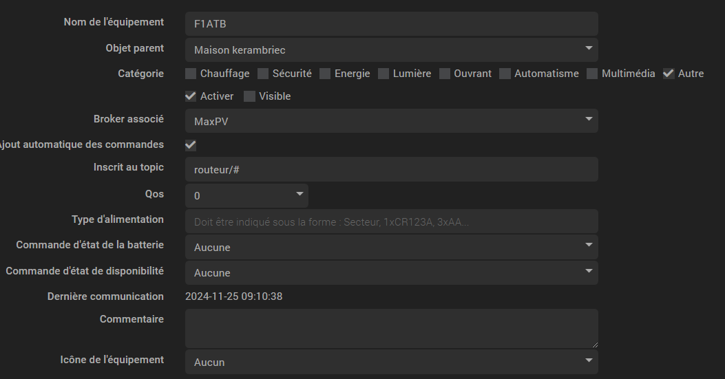 De mon côté aussi j’utilise MaxPV avec jeedom et jmqtt, ça fonctionne bien. J’ai fait ce routeur pour ma fille qui habite à Vitrolles (c’est bien loin du Finistère). Le chauffe eau est loin du tableau électrique et c’est pour cela que j’ai choisi F1ATB. J’ai fait le montage chez moi pour faire les tests et la 12.06 est la première version que j’ai programmé dans les ESP32. J’ai fait un post sur le forum F1ATB, j’attends des retours si c’est un problème de version ? Il y avait un post sur le forum jeedom au sujet de jmqtt mais, les données remontaient bien, il fallait simplement les décomposer en créant des commandes info.