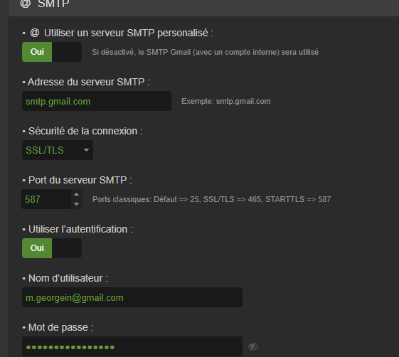 Donc si tu mets le port 587 il faut choisir START TLS et non SSL/TLS