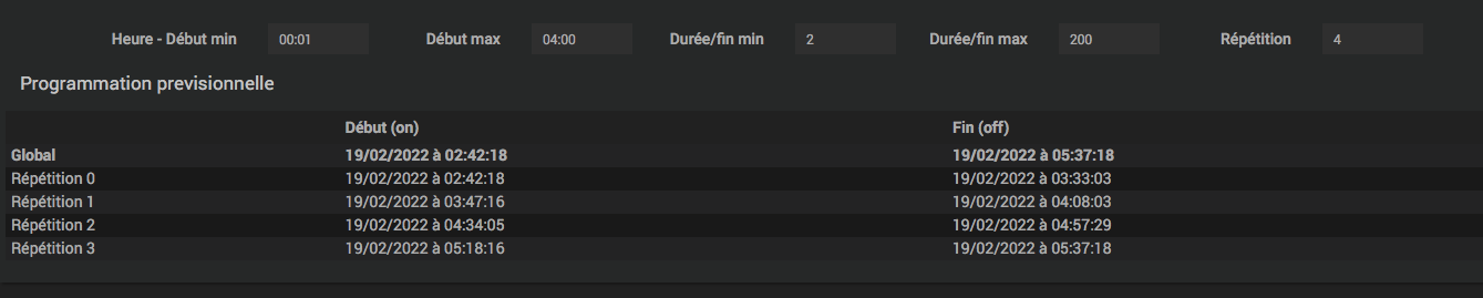allumage 5 fois, pour une durée comprise entre 5 et 15 minutes, dans la plage 00:00 > 04h00 , cela me simule qu’une repetition. Pourtant 5x15 minutes ca rentre bien dans la plage de 4H ???