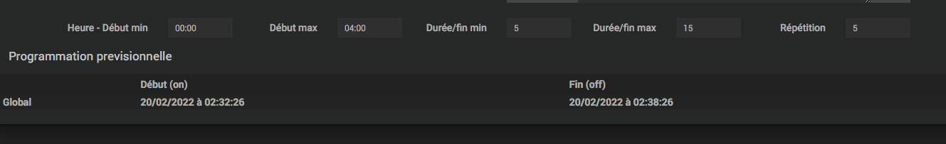 Je voudrais qu’il allume la lumière de manière aléatoire 4 fois, de 2 à 12mns, entre 15mns avant le coucher du soleil et 540mns après le coucher du soleil. Il ne m’en génère qu’un, qu’ai-je fait de mal svp ?