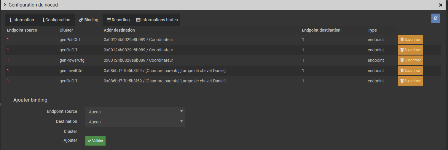 Il ne reste plus qu’à sélectionner un « Endpoint source » (normalement 1 s’il n’y a qu’un seul contrôleur Zigbee), et l’équipement à commander dans la liste (« Eclairage Table » par exemple).