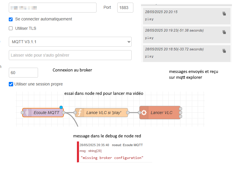 Je souhaite faire interagir jeedom et un pc distant lorsque j’appuie sur un bouton. Le but c’est d’envoyer un message via mqtt et le réceptionner via red node sur le pc distant est lancer une vidéo j’ai vérifié avec mqtt explorer le message est bien reçu sur le pc distant mais red node ne voit rien.