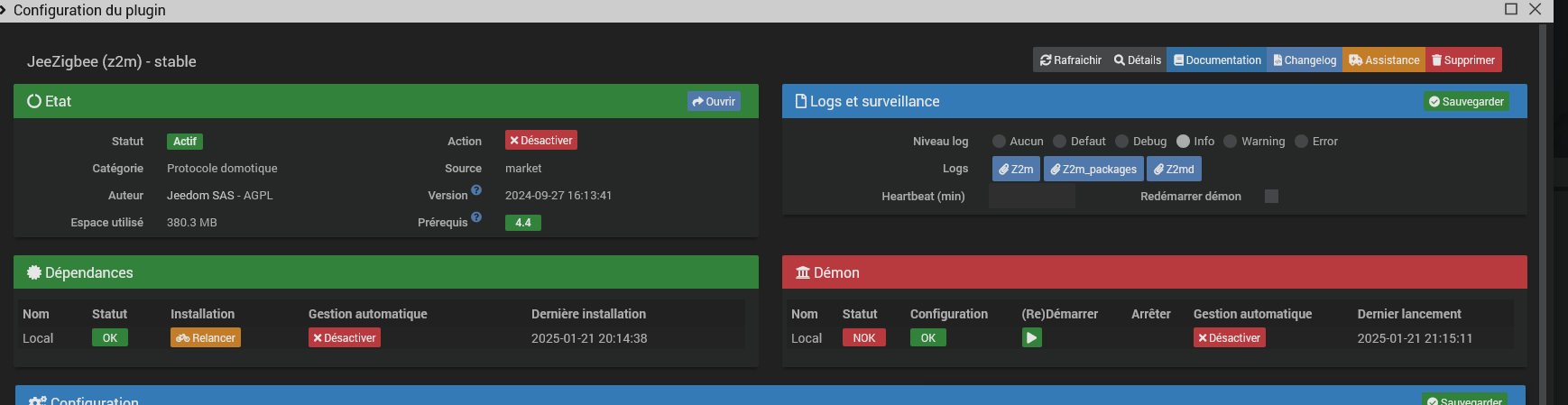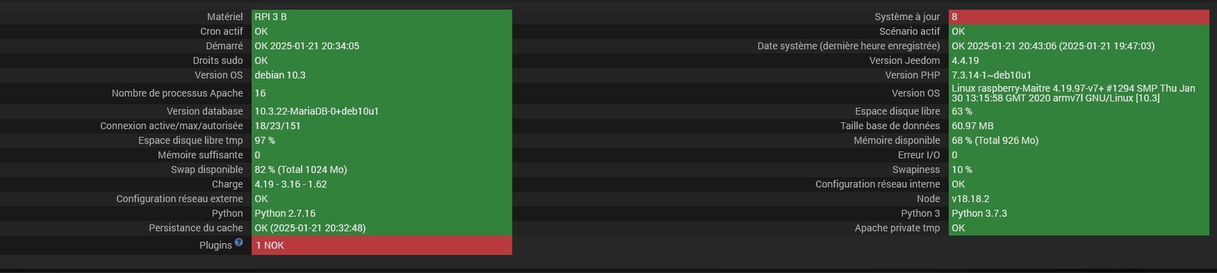 la seul fois ou la page santé a réussis à s’afficher, apres 5 mins… le plugin NOK est le jeezeegbi qui ne souhaite plus se lancer âpres redémarrage des dépendances pour valider une MAJ qu’il me demandait de faire