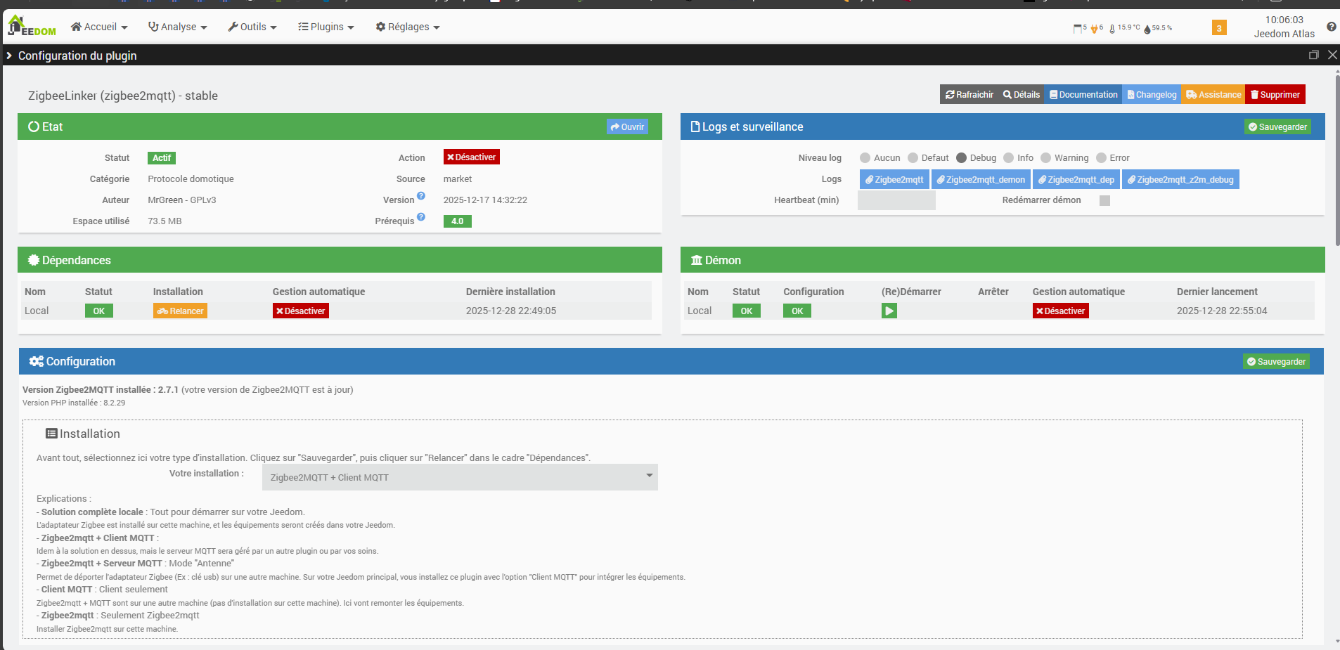 Tout fonctionnait sauf Zigbee ou le demon restait en KO. Pour savoir pourquoi j’ai relancé zigbeelinker en debug et paf la 1/2 des devices ont fonctionné. la moitié de la moitié restante était hors ligne et le restant en ligne mais ne répondait pas. Et rien dans le debug pour me dire ce qu’i se passe puisque cela fonctionne !!
