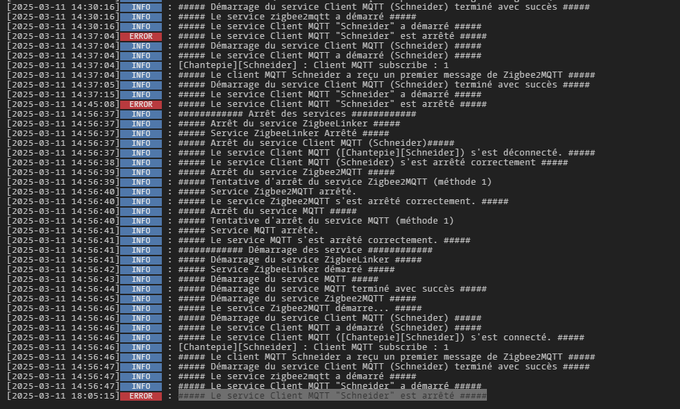 Depuis quelques jours ( et je ne pense pas avoir fait de modifications), j’ai « le service client MQTT » qui s’arrête de façon aléatoire (parfois au bout de 5 minutes parfois au bout de plusieurs heures, (exemple dans la copie d’écran)
