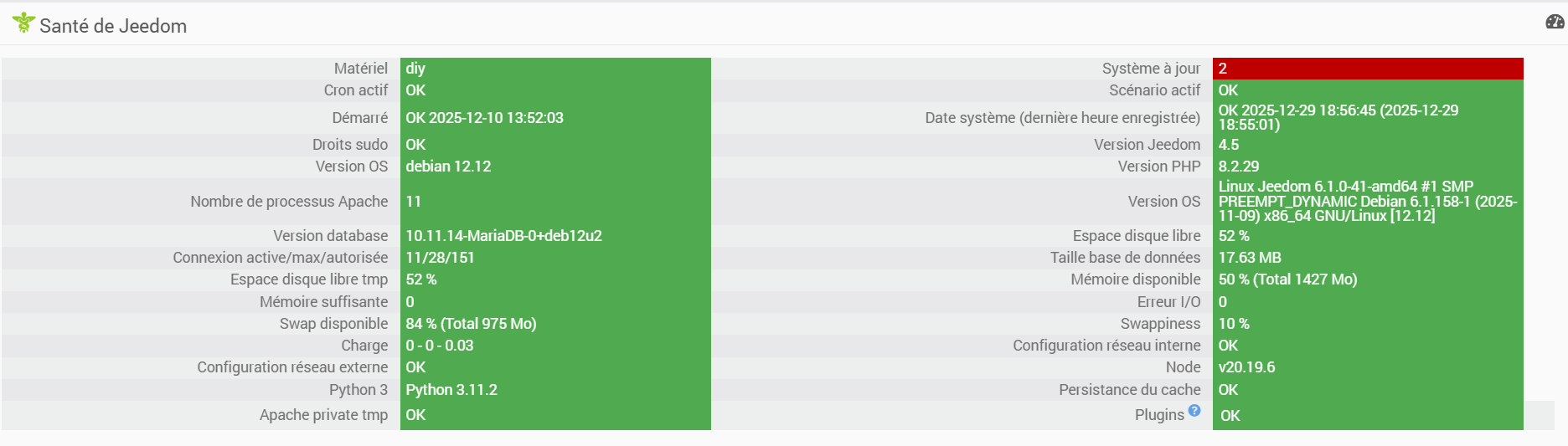 Voici la page santé et mon Jeedom n’est pas saturé, il tourne sur un NAS. CPU à 9 ou 10% de charge