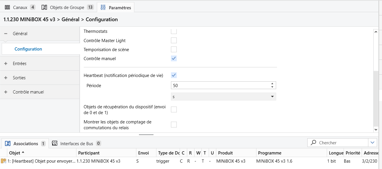 Pour éviter cela j’ai choisi un équipement KNX qui m’a permis avec sa configuration Heartbeat d’envoyer régulièrement un GA toutes les 50 secondes et miracle plus de redémarrage du bus moniteur et plus de saturation du bus.