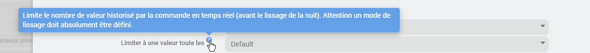 Limiter à une valeur : paramètre assez récent, il permet de limiter l’arrivée de valeurs dans le conteneur history. Si, par exemple, vous mettez 5 min, et qu’à 15h01 la valeur 5 arrive et à 15h02 la valeur 15 arrive, alors Jeedom va regarder le mode de lissage et appliquer le calcul. Dans notre cas, si vous êtes en mode moyenne, alors Jeedom stockera à la date de 15h00 la valeur 10. Vous remarquerez que c’est à la date de 15h00 car c’est une valeur toutes les 5 min, donc 15h00, 15h05, et ainsi de suite. Cette option est très intéressante si vous avez une commande qui a souvent une valeur (toutes les secondes, par exemple)