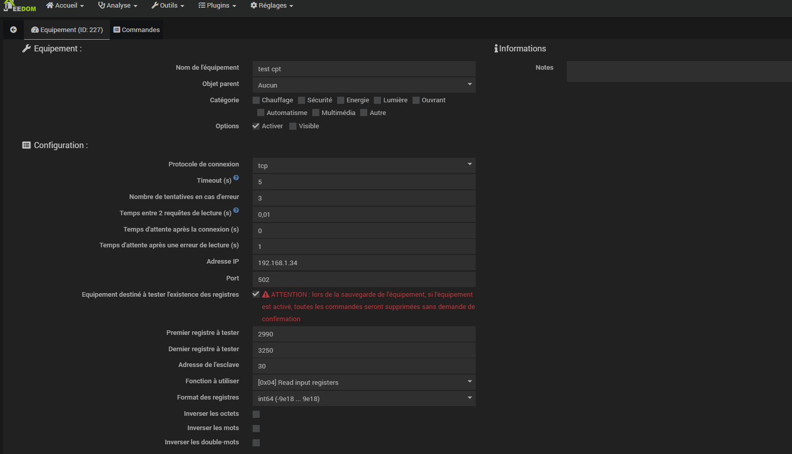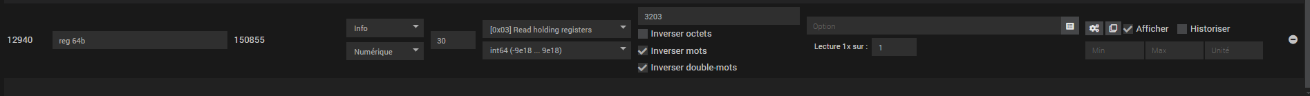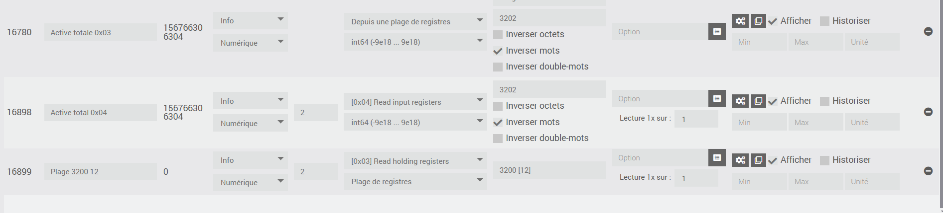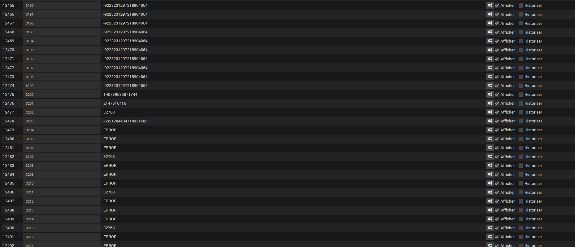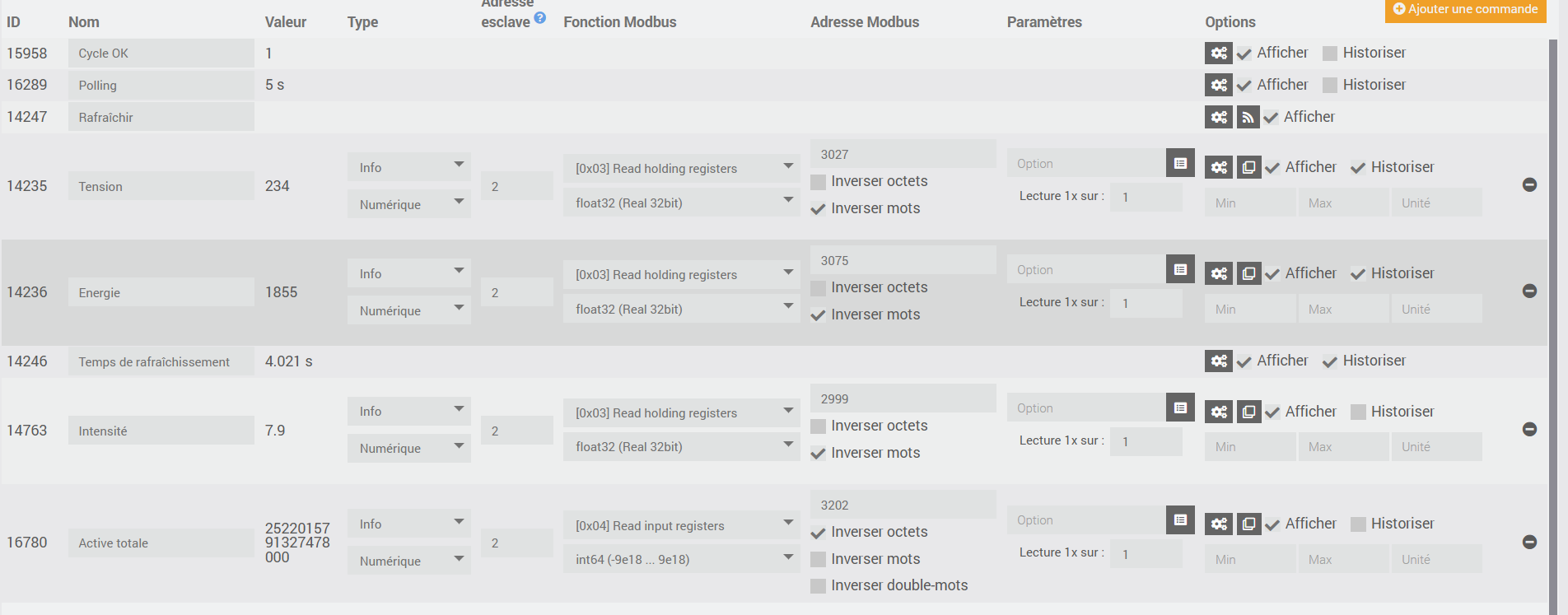 [2024-11-10 19:55:30] DEBUG : mymodbus::sendToDaemon * params = array ( 'CMD' => 'newDaemonConfig', 'config' => array ( 0 => array ( 'id' => '1095', 'name' => 'Comptage générale', 'eqProtocol' => 'tcp', 'eqRefreshMode' => 'polling', 'eqPolling' => '5', 'eqTimeout' => '3', 'eqWriteCmdCheckTimeout' => '1', 'eqRetries' => '3', 'eqFirstDelay' => '0', 'eqErrorDelay' => '1', 'eqAddr' => '192.168.1.34', 'eqPort' => '502', 'cmds' => array ( 0 => array ( 'id' => '14235', 'name' => 'Tension', 'type' => 'info', 'cmdSlave' => '2', 'cmdFctModbus' => '3', 'cmdFormat' => 'f', 'cmdAddress' => '3027', 'cmdFrequency' => '1', 'cmdInvertBytes' => '0', 'cmdInvertWords' => '1', 'cmdInvertDWords' => '0', 'repeat' => '0', ), 1 => array ( 'id' => '14236', 'name' => 'Energie', 'type' => 'info', 'cmdSlave' => '2', 'cmdFctModbus' => '3', 'cmdFormat' => 'f', 'cmdAddress' => '3075', 'cmdFrequency' => '1', 'cmdInvertBytes' => '0', 'cmdInvertWords' => '1', 'cmdInvertDWords' => '0', 'repeat' => '0', ), 2 => array ( 'id' => '14763', 'name' => 'Intensité', 'type' => 'info', 'cmdSlave' => '2', 'cmdFctModbus' => '3', 'cmdFormat' => 'f', 'cmdAddress' => '2999', 'cmdFrequency' => '1', 'cmdInvertBytes' => '0', 'cmdInvertWords' => '1', 'cmdInvertDWords' => '0', 'repeat' => '0', ), 3 => array ( 'id' => '16780', 'name' => 'Active totale', 'type' => 'info', 'cmdSlave' => '2', 'cmdFctModbus' => '3', 'cmdFormat' => 'q', 'cmdAddress' => '3202', 'cmdFrequency' => '1', 'cmdInvertBytes' => '0', 'cmdInvertWords' => '1', 'cmdInvertDWords' => '0', 'repeat' => '0', ), ), ), ), )