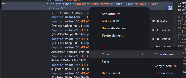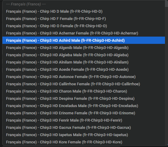 sur la page de configuration du plugin, bouton droit de la souris à l’endroit où la liste des voix est affichée, puis dans le menu choisir « inspecter » et dans la fenêtre qui s’affiche (dans l’onglet éléments), bouton droit sur la partie « Select » et « Copier / Copier Element » et ca copie tout le contenu dans le presse-papiers et ensuite tu peux faire coller dans un fichier texte, et tu auras tous les codes ![]()