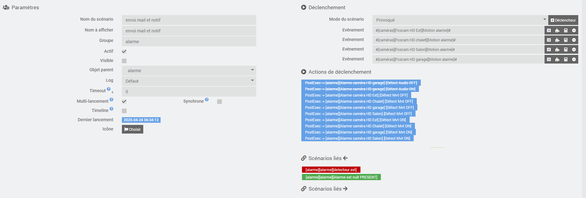 [2025-04-23 13:56:03][SCENARIO] -- Début : Scenario execute automatiquement sur evenement venant de : [alarme][capteurs AR][capteur mouvement] (0).