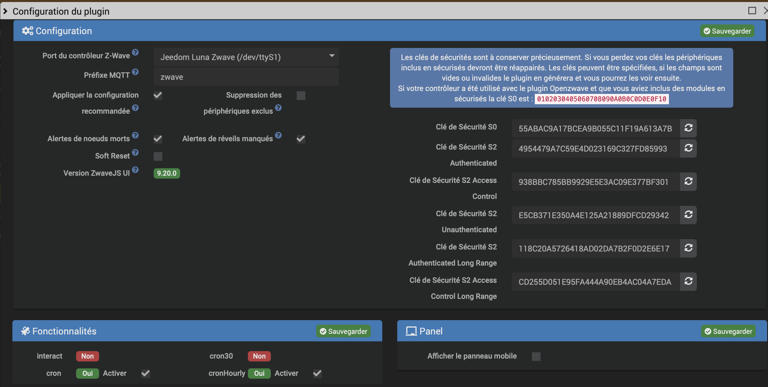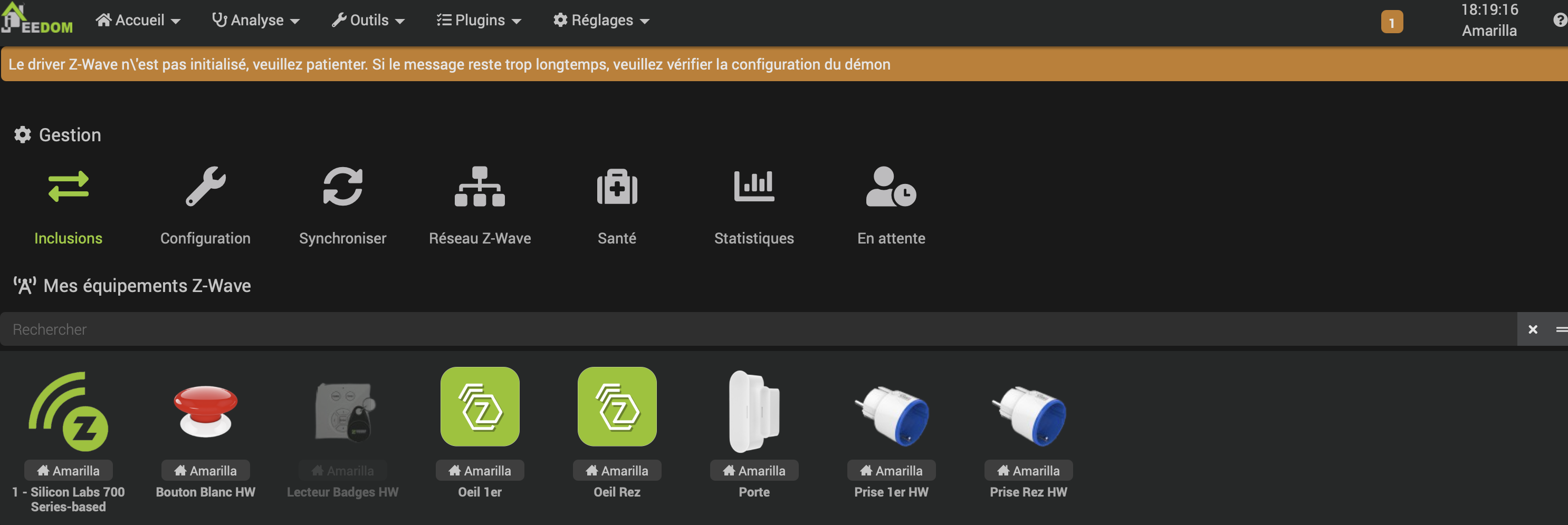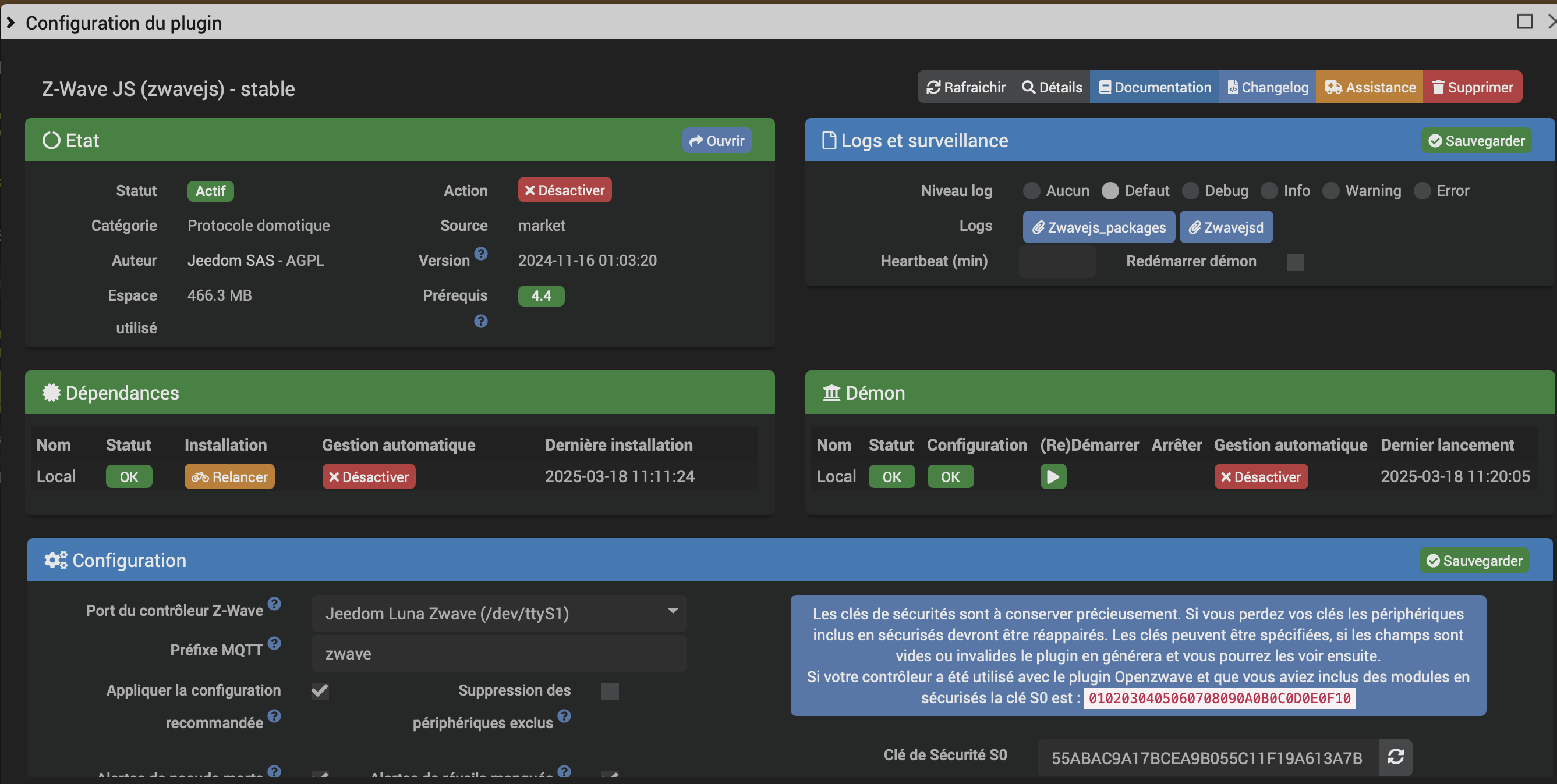 Case à cocher « Soft Reset » décochée, relance du calcul des dépendances sur les plugins mqtt puis zwaveJS effectués sans succès. Et chose étonnante, les périphériques zwave+ (2 « yeux », 2 switches 230V, un détecteur d’ouverture de porte et un bouton-poussoir) communiquent parfaitement avec la Luna… mais la ligne « Le driver…» est toujours là !