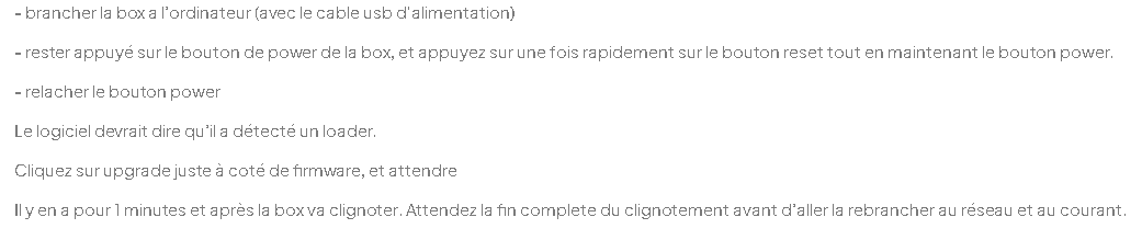 Oui, tout est décompressé et les drivers sont installés sans problème. Le programme se plante avant de demande de sélectionner le fichier image (que tu as marqué par un 1). Donc bien avant de brancher la box…