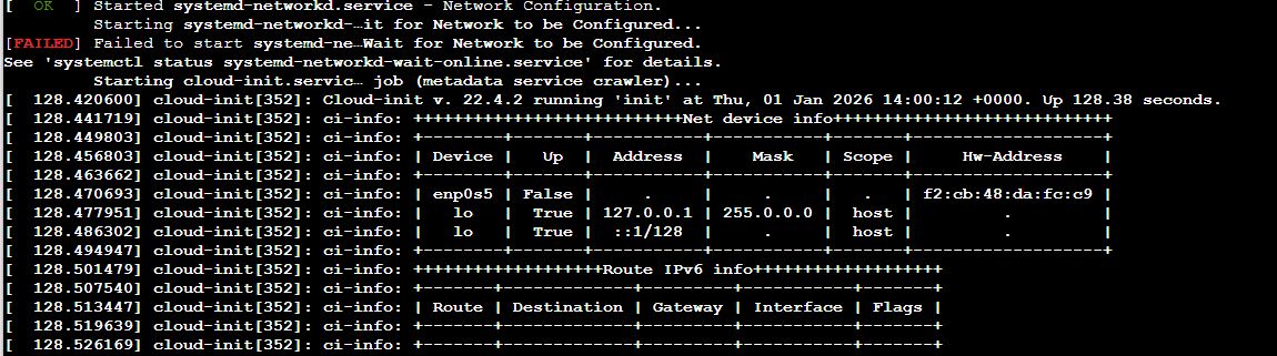 L’onglet annonce que la VM est « allumé » mais juste au dessus il est indiqué « non connecté »,j’ai attendu une bonne dizaines de minutes et impossible d’aller dans l’onglet « reseaux » (grisé), je lance donc la console et voici ce que je retrouve dans les logs :