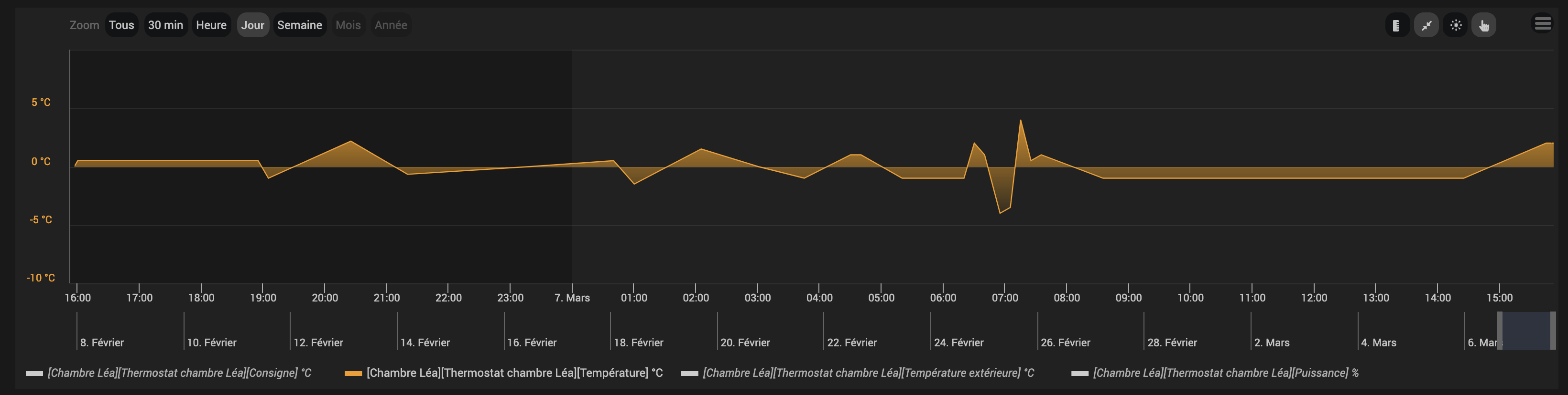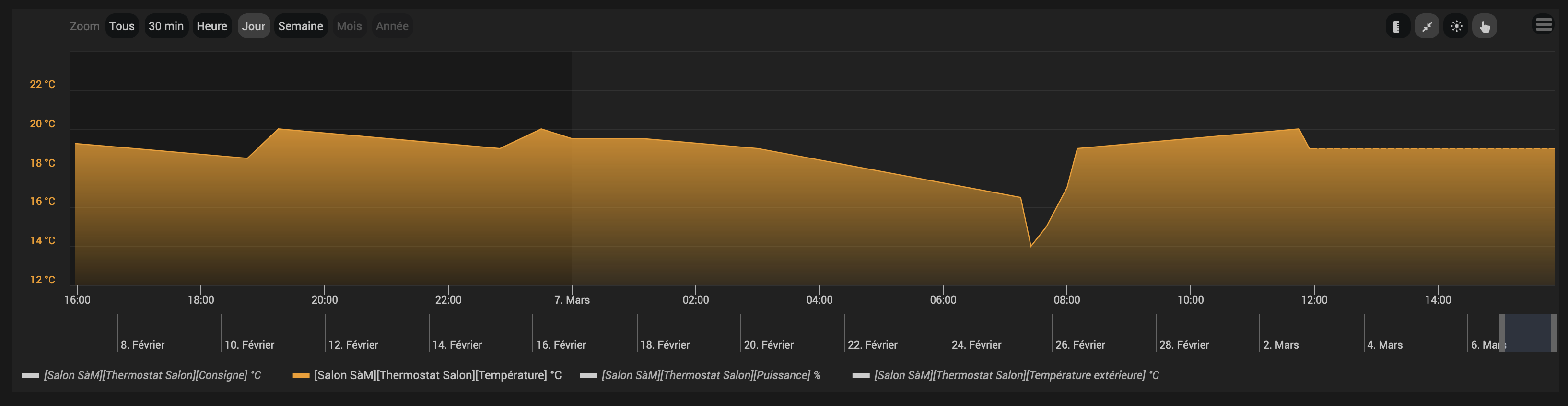 Je débute avec Jeedom depuis un mois ou deux avec une box Atlas. Jusqu’ici tout va bien, je découvre les scenarios et entre autre le plug in thermostat qui me permet de gérer mes chauffages, la chaudière et les clims. Tout fonctionne bien sauf dans la visualisation du fonctionnement du thermostat accessible depuis le menu accueil, pour une seule pièce la courbe de température intérieure est toujours autour de 0 degrés alors que dans le panneau du thermostat de cette pièce la valeur est bonne et que tout fonctionne.