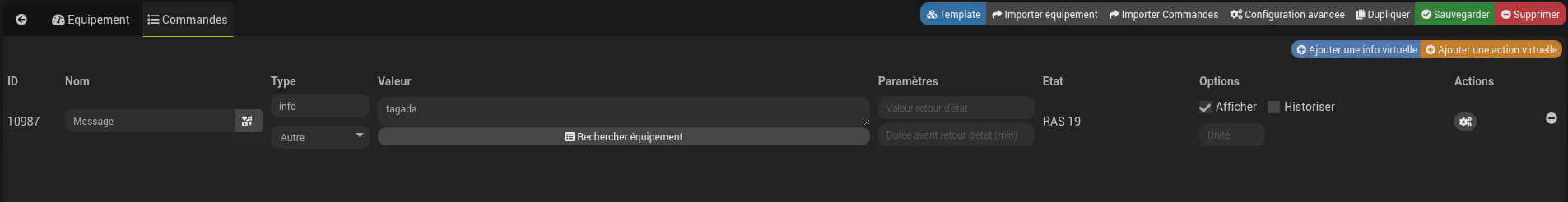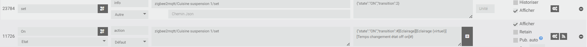 Quand j’allume ma lumière avec la commande ON : {« state »:« ON »,« transition »:#[Eclairage][Eclairage (virtuel)][Temps changement état off on]#}, le resultat attendu et qui est envoyé en mqtt est celui-ci {« state »:« ON »,« transition »:2}, SAUF que ce qui etait envoyé avant que je resauvegarde mon virtuel la valeur virtuelle #[Eclairage][Eclairage (virtuel)][Temps changement état off on]# ne renvoyait plus rien et ce qui etait envoyé était : {« state »:« ON »,« transition »:« »}.