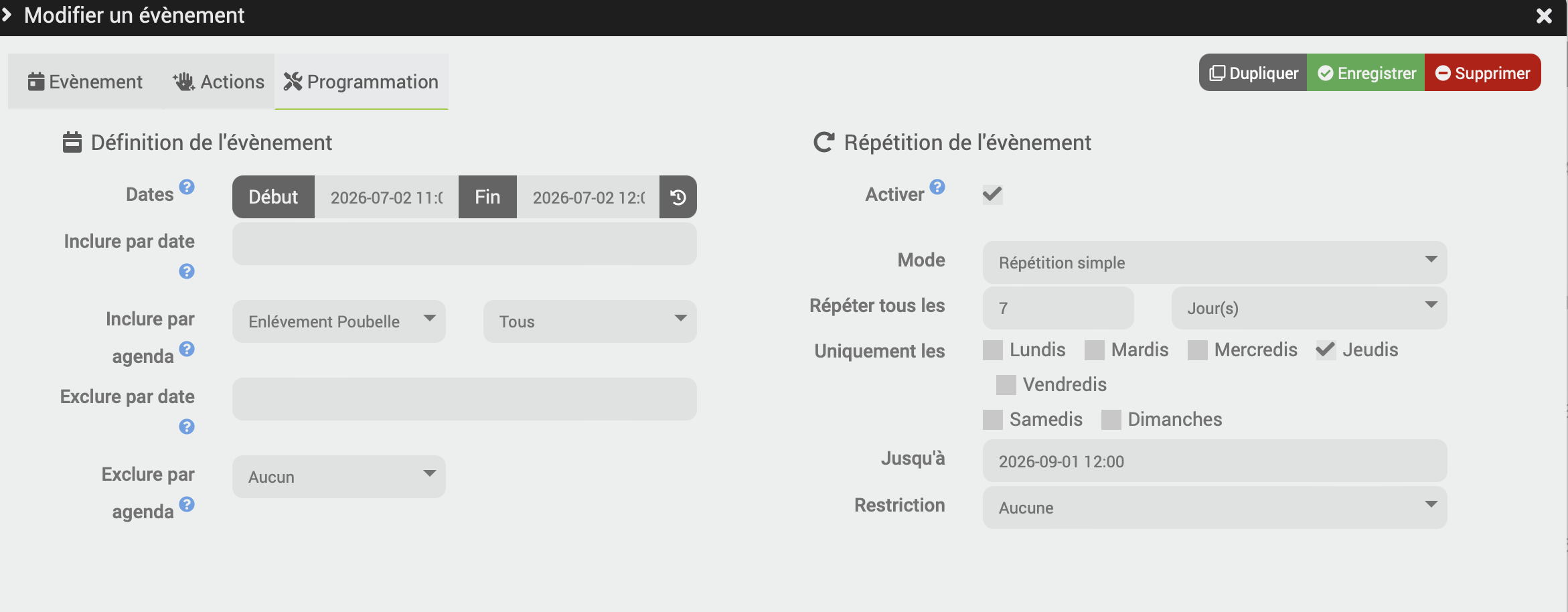 Merci, j’aurais du être plus clair, l’évènement crée (en juillet pour les jeudis) est visible le lundi ‹ poubelle verte jeudi › en janvier. Il est aussi visible les jeudis en juillet…Je vais tout effacer et recréer le évènements.