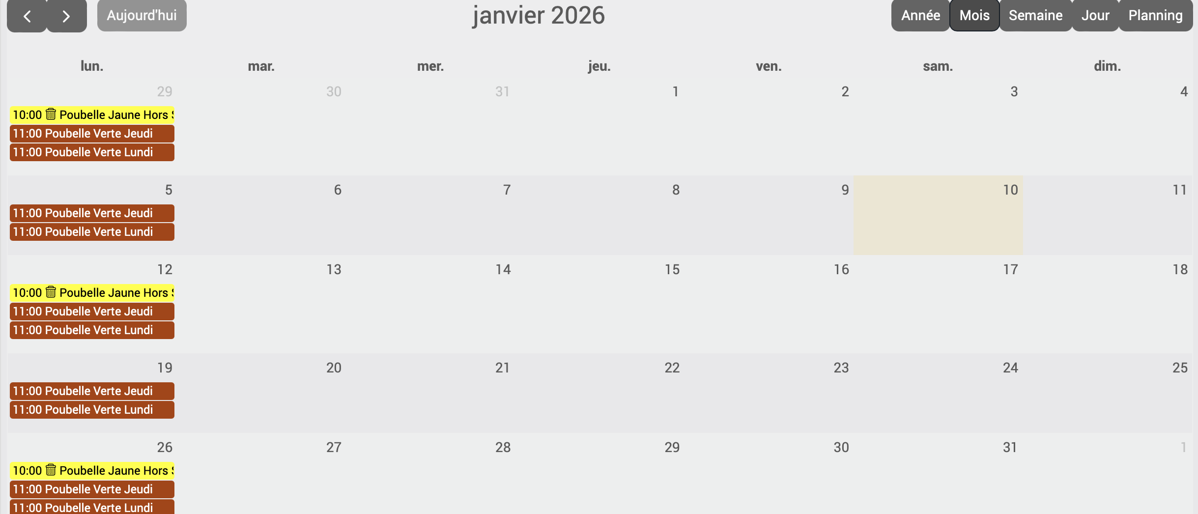 J’ai crée un calendrier avec des événements sur le passage des poubelles. Ce que je vois dans le calendrier n’est pas le reflet de l’événement. L’évènement du jeudi est visible le lundi.