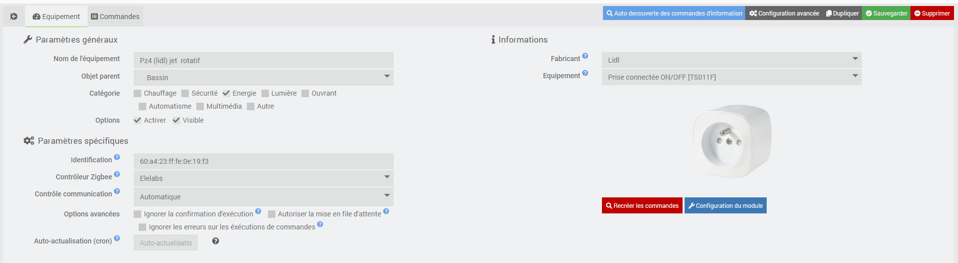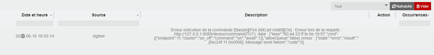 Ce sénario commande les jets d’eau d’un bassin via l’alimentation de deux pompe dont le module PZ4 qui déclanche depuis quelque temps ce message d’erreur. Chaque fois que je déclanche manuellement le module en marche et arret il fonctionne correctement. le sénario se lance 10 fois par jour et sur chaque sénario je déclanche 6 fois le module PZ4 en on ou off et je n’ai le message d’erreur qu’une fois par jour au maximum. L’installation fonctionne depuis 2 ans et je n’ai jamais eu ce message avant. Je ne sais pas interréter ce message, merci pour votre aide.