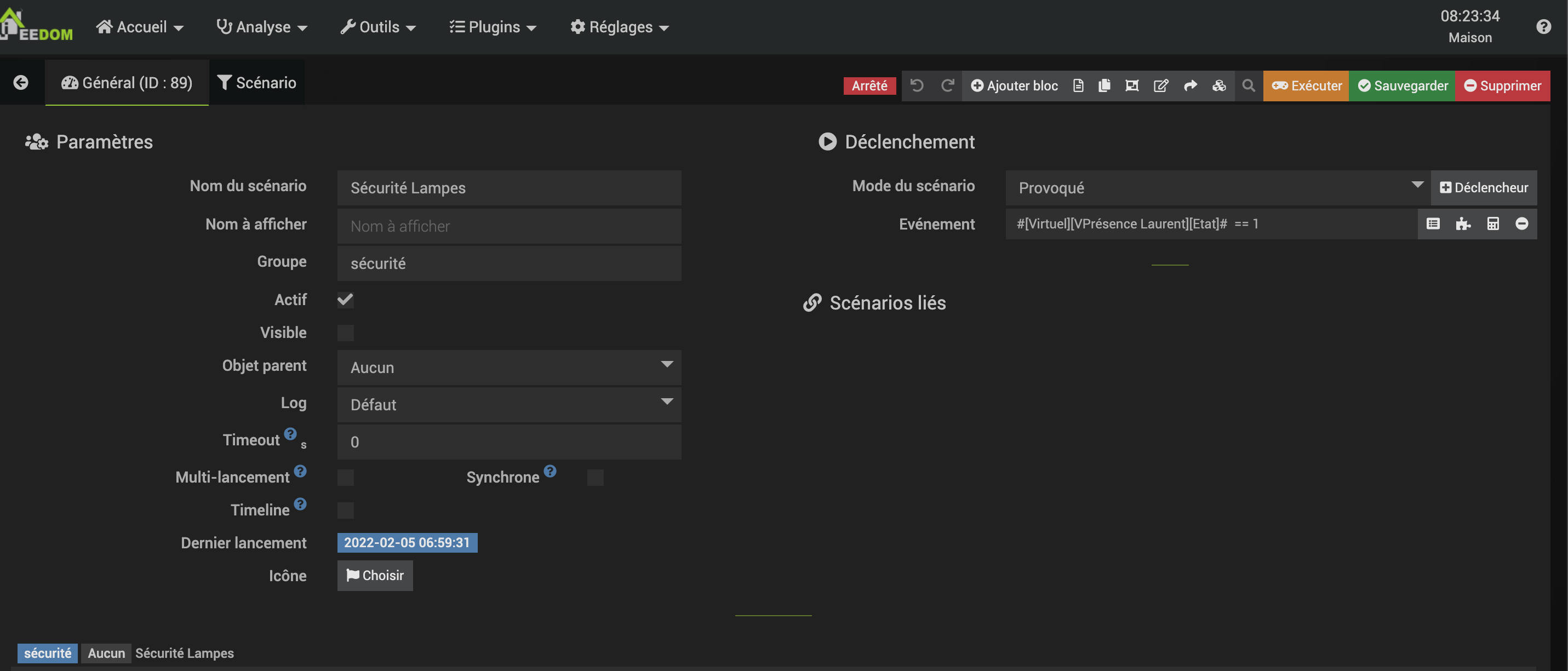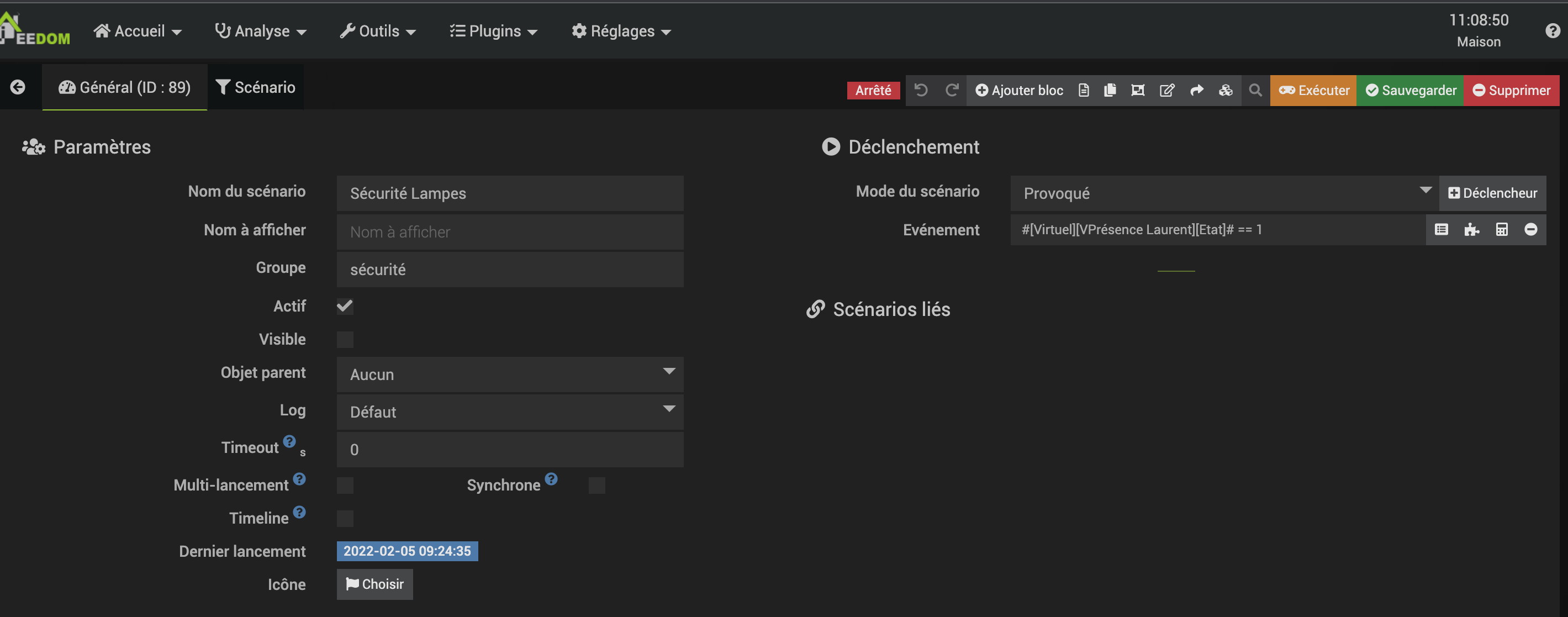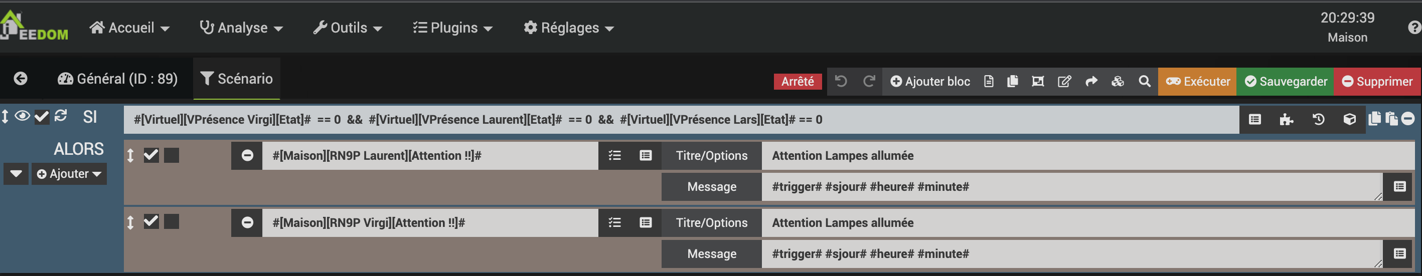 C’est ce que j’ai essayé aussi, j’ai mis comme déclencheur presence == 0 et dans la condition SI juste 2 lampes pour essayer