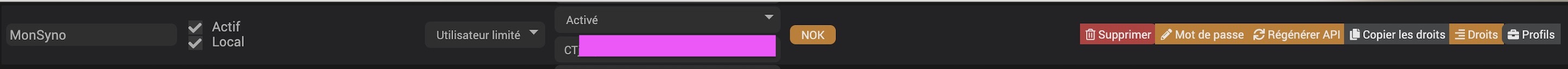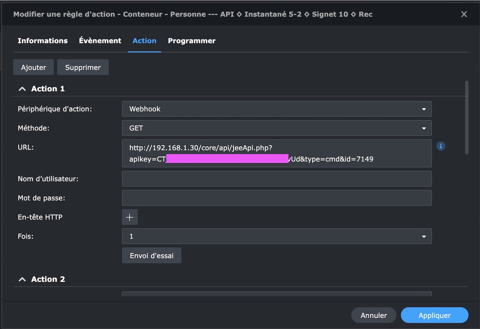 Ici elle commence par CT… c’est cette clef qu’il faut utiliser dans l’adresse / la commande API indiquée dans la Règle coté Synology.