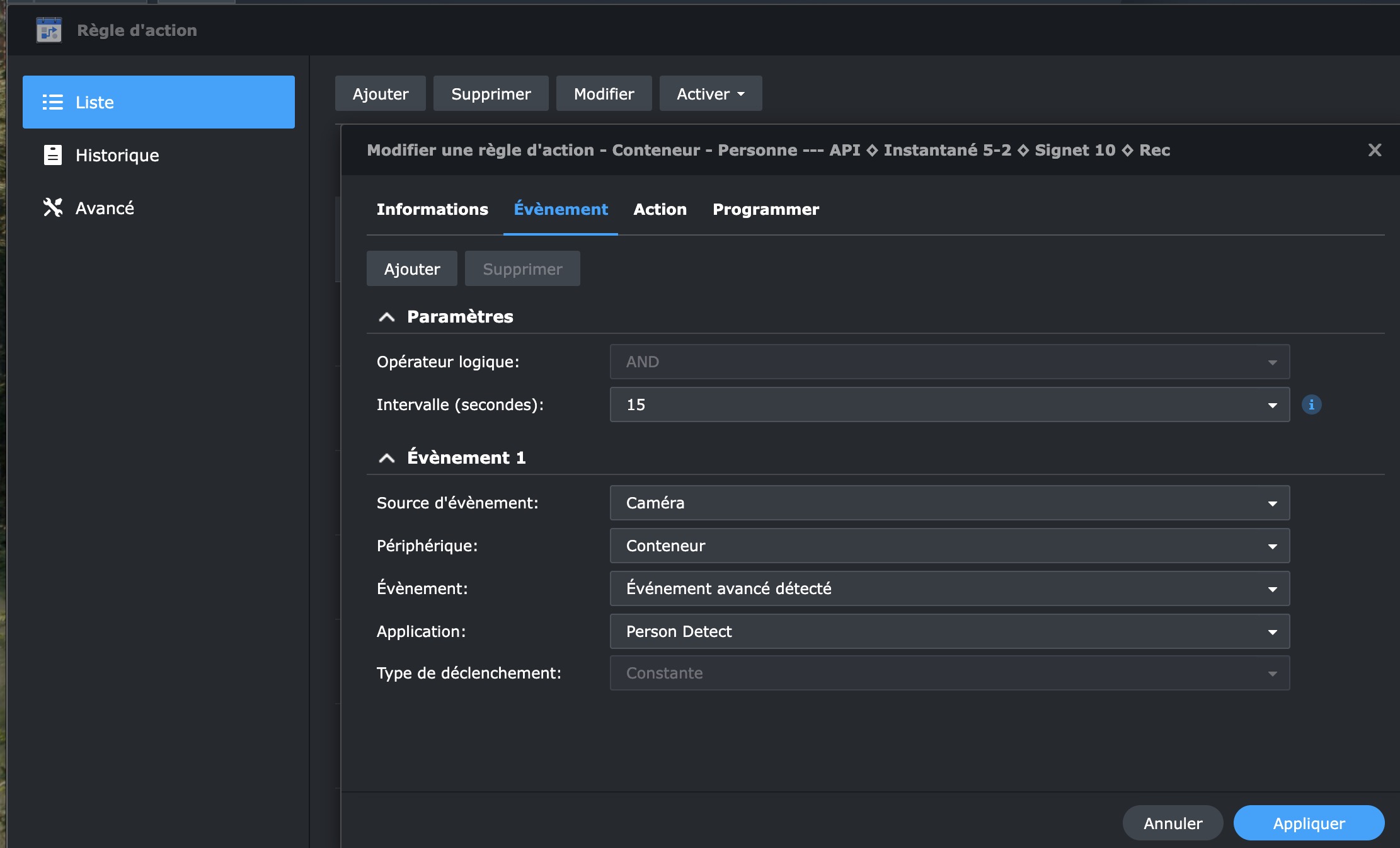 le déclencheur / l’évènement est la détection de personne sur la caméra souhaitée.