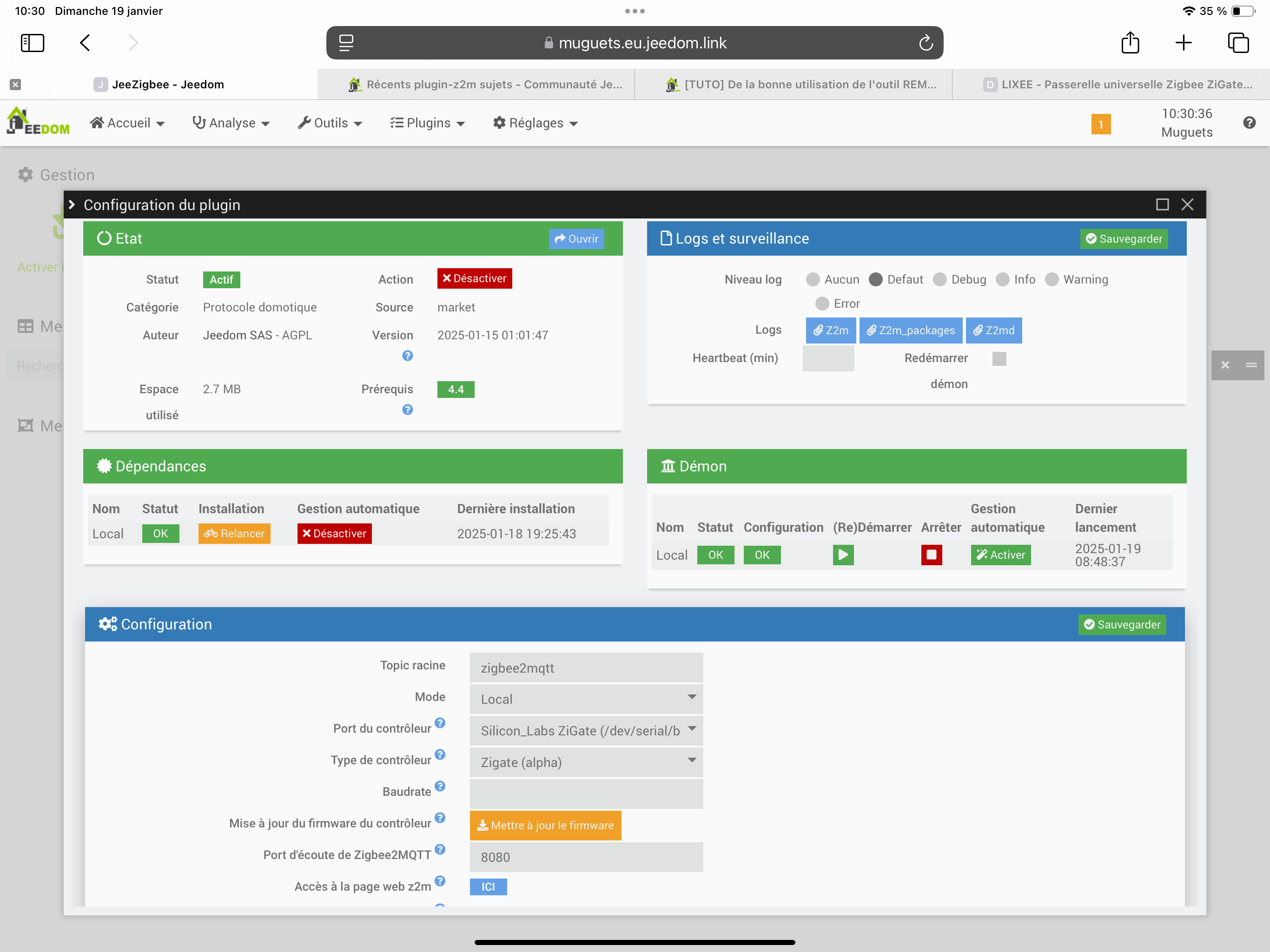 Bonjour, suite un un redémarrage de Jeedom mon plugin zigbee ne veut plus démarrer. Je pense que cela est dû à un problème de mise à jour de paquet.
