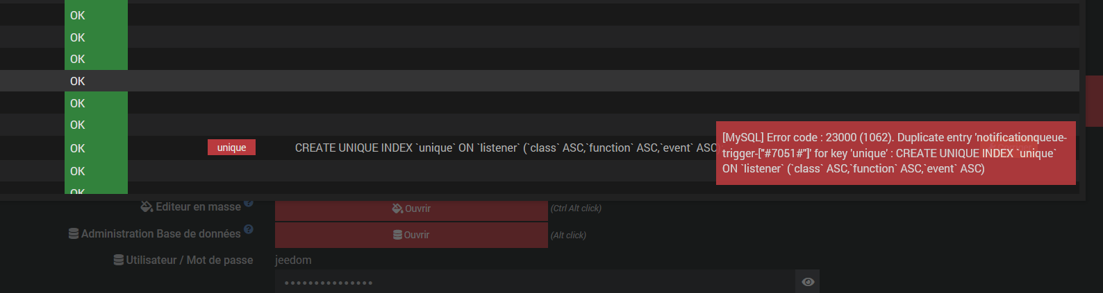 « Lors de la mise à jour il est possible que vous ayez une erreur de création d’indexe unique sur la table listener, rien de grave c’est du à des listener dupliqué et jeedom corrigera ca de lui meme au bout de 24h (l’indexe en lui meme pourra etre fait soit depuis la verification de la base de données dans la configuration de jeedom ou juste attendre les prochaines mises à jour). »