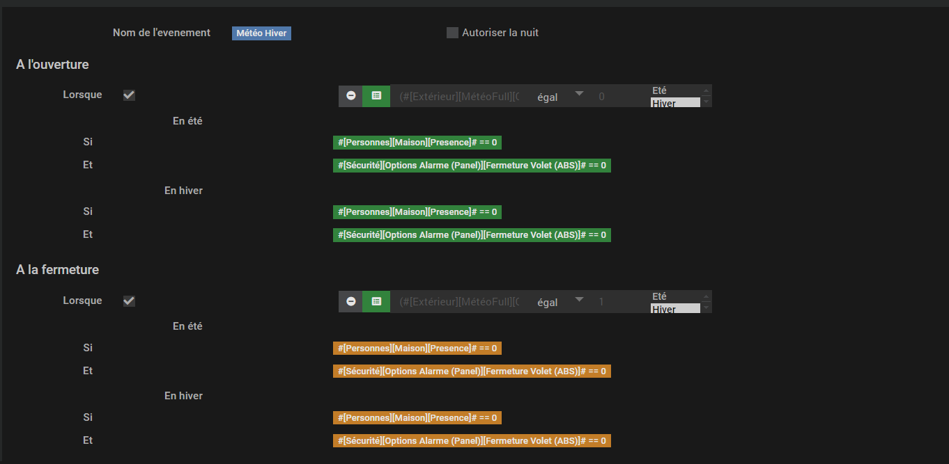 (#[Extérieur][MétéoFull][Condition actuelle]# matches "/Nuit/") OU !((#[Extérieur][MétéoFull][Condition actuelle]# matches "/Ensoleillé/") OU (#[Extérieur][MétéoFull][Condition actuelle]# matches "/Ciel voilé/") OU (#[Extérieur][MétéoFull][Condition actuelle]# matches "/Faibles passages nuageux/") OU (#[Extérieur][MétéoFull][Condition actuelle]# matches "/Stratus/") OU (#[Extérieur][MétéoFull][Condition actuelle]# matches "/Stratus se dissipant/") OU (#[Extérieur][MétéoFull][Condition actuelle]# matches "/Eclaircies/") OU (#[Extérieur][MétéoFull][Condition actuelle]# matches "/Faiblement nuageux/") OU (#[Extérieur][MétéoFull][Condition actuelle]# matches "/Fortement nuageux/"))