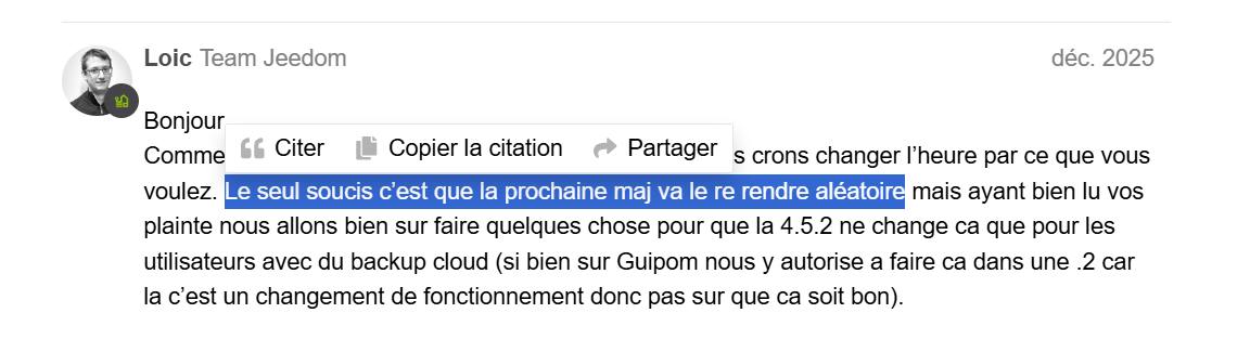 En complément du sujet, étant en 4.5 j’avais modifié l’heure de lancement de la sauvegarde sur un équipement local, pour que cette sauvegarde se fasse de nuit.