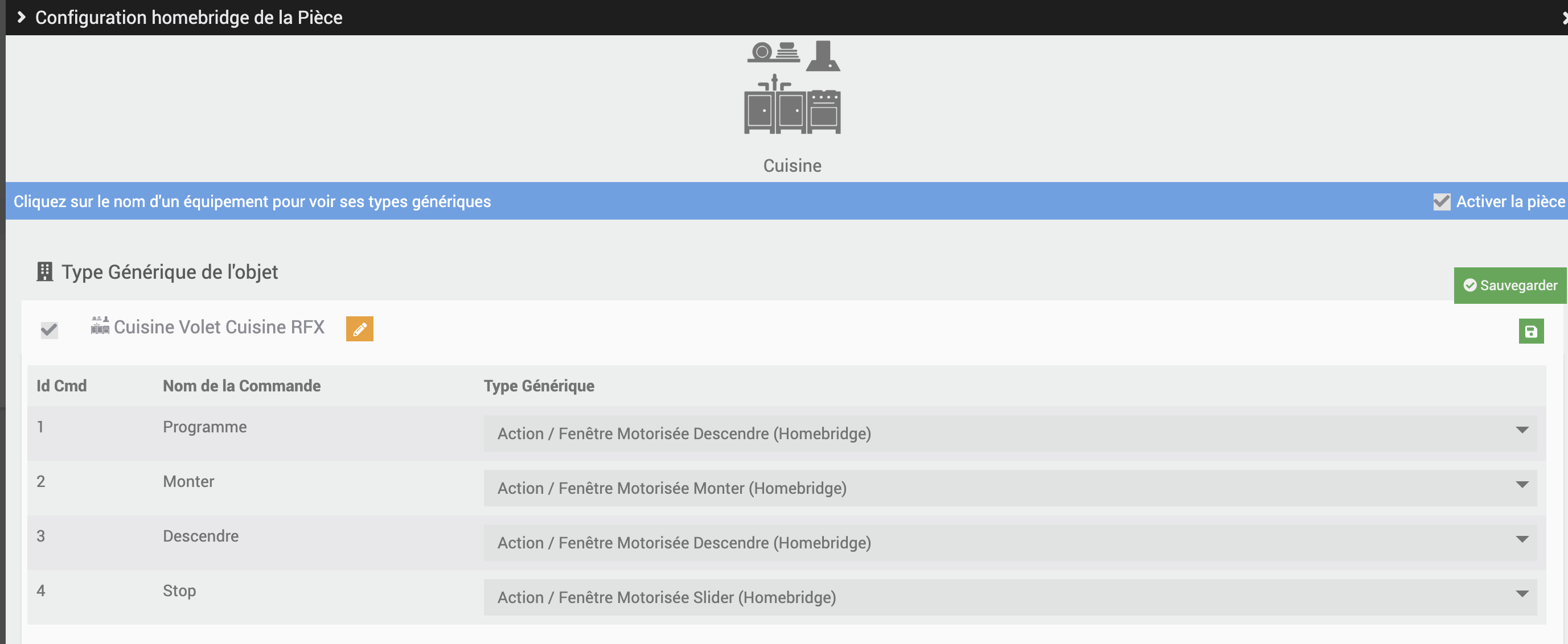 [1/10/2020, 12:31:21 PM] [Homebridge] [DEBUG] eqLogic > {"id":"2","name":"Volet Cuisine RFX","logicalId":"139BDC","generic_type":null,"object_id":"4","eqType_name":"rfxcom","isVisible":1,"isEnable":1,"order":"9999","comment":null,"tags":null,"status":{"lastCommunication":"2020-01-09 19:35:24","timeout":0},"services":{"windowMoto":[{"down":{"id":"1","logicalId":"0C1A0000 #ID# #GROUP# 0700000000","generic_type":"WINDOW_DOWN","eqType":"rfxcom","name":"Programme","order":"0","type":"action","subType":"other","eqLogic_id":"2","value":"","isVisible":0,"alert":[],"display":{"invertBinary":0}}},{"up":{"id":"2","logicalId":"0C1A0000 #ID# #GROUP# 0100000000","generic_type":"WINDOW_UP","eqType":"rfxcom","name":"Monter","order":"1","type":"action","subType":"other","eqLogic_id":"2","value":"","isVisible":1,"alert":[],"display":{"invertBinary":0}}},{"down":{"id":"3","logicalId":"0C1A0000 #ID# #GROUP# 0300000000","generic_type":"WINDOW_DOWN","eqType":"rfxcom","name":"Descendre","order":"2","type":"action","subType":"other","eqLogic_id":"2","value":"","isVisible":1,"alert":[],"display":{"invertBinary":0}}},{"slider":{"id":"4","logicalId":"0C1A0000 #ID# #GROUP#0000000000","generic_type":"WINDOW_SLIDER","eqType":"rfxcom","name":"Stop","order":"3","type":"action","subType":"other","eqLogic_id":"2","value":"","isVisible":1,"alert":[],"display":{"invertBinary":0}}}]}}