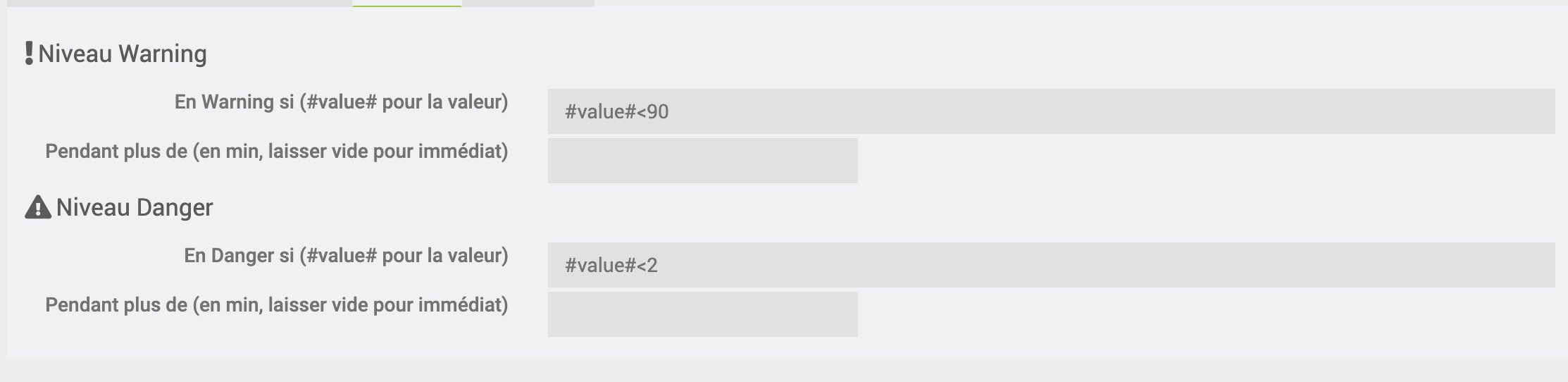 sur un équipement je voudrais utiliser le niveau warning et danger.