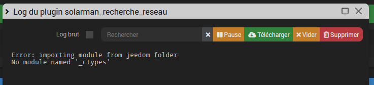 J’ai fait l’installation des dépedances et j’ai voulu scanner le réseau, mais j’ai cette erreur qui est remonté dans la log « Error: importing module from jeedom folder No module named ‹ _ctypes › ».