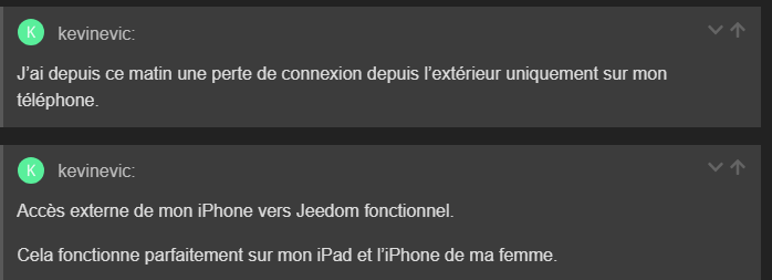 Rien n’a été changé du coté Jeedom, excepté la mise a jour de l’application sur l’iphone depuis ce matin. Peut etre faut il changer des configurations depuis l’update de l’application