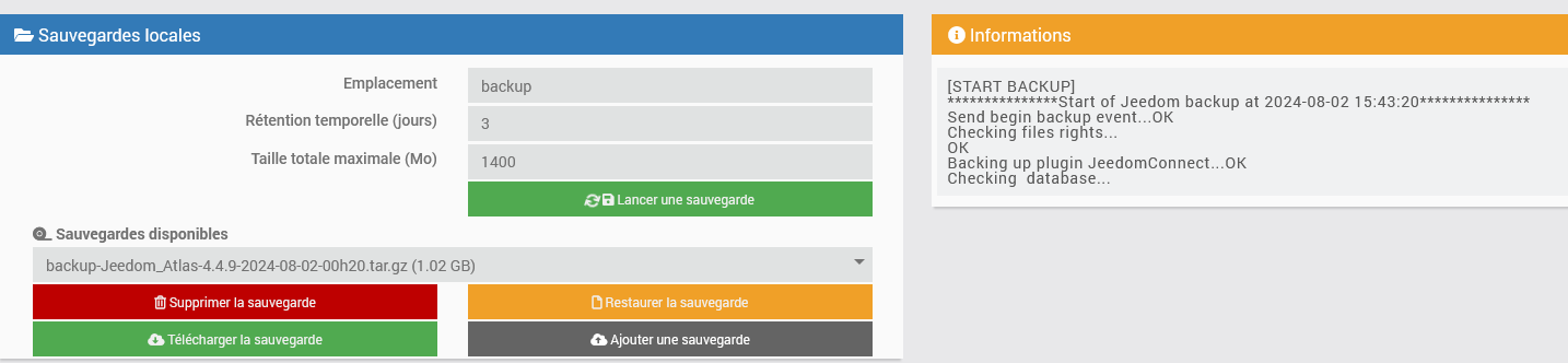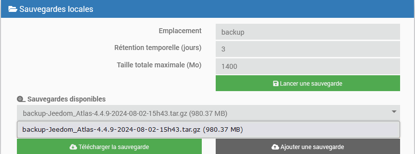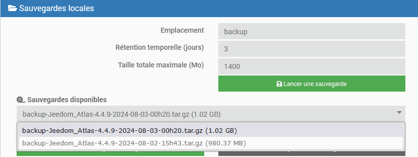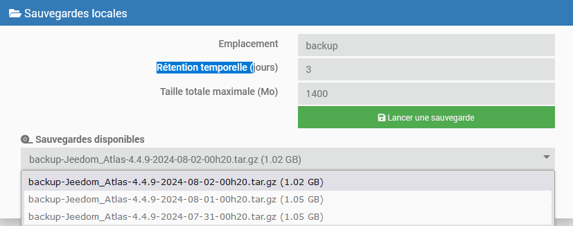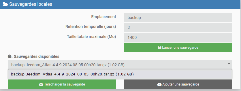 Relis ce que j’ai dit… Jeedom lance le nettoyage il trouve 2 backups c’est > a 1400mo il supprime le plus vieux il regarde c’est bon 1go < 1,4go, ensuite il lance le nouveau backup, tu te retrouves donc avec deux backups. C’est bien ce qui est attendu et conforme au réglage.