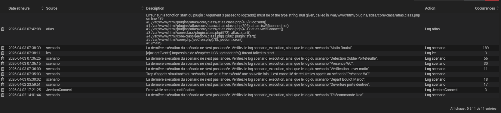 0288|[2026-04-03 07:42:08] ERROR Erreur sur la fonction start du plugin : Argument 3 passed to log::add() must be of the type string, null given, called in /var/www/html/plugins/atlas/core/class/atlas.class.php on line 439