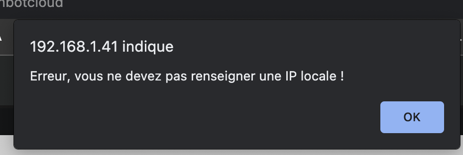 Merci. J’ai mis l’adresse IP locale mans quand je clique pour regénérer les Webhooks, il me dit « Erreur, vous ne devez pas renseigner une IP locale ! ».