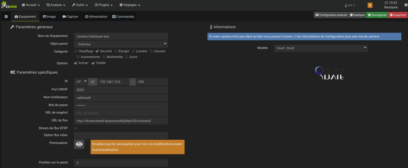 Stream du flux RTSP : si vous etês en mode flux video (URL du flux remplis) alors vous pouvez voir la camera sous forme de flux video au lieu d’image par image. Attention cette option est très consommatrice de ressources et rend la 1er image très à arriver.