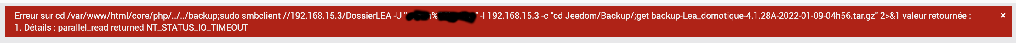 Ben là vu l’erreur c’est le protocol samba qui tombe en timeout… et comme je connais ni ton réseau ni ton NAS ou autre le plus simple est donc de copier uniquement sur ton jeedom en local le backup que tu veux restaurer et une fois copié dans le bon dossier lancer la restauration via le menu de Jeedom