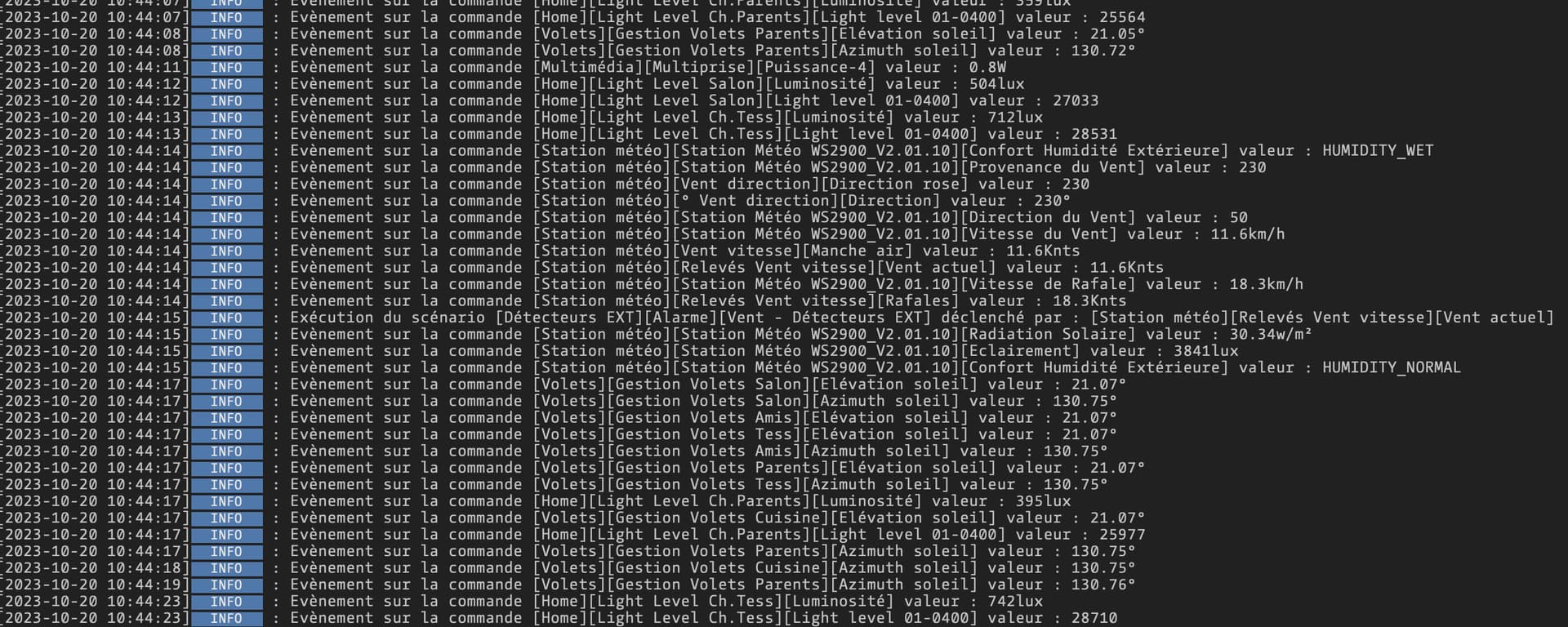 Concernant le CPU, on voit qu’il est pas mal chargé. Quand je regarde dans le temps réel, il y des équipements qui discutent beaucoup, notamment ma station météo, le plugin Gestion des volets et mes détecteurs de luminosité Zigbee :