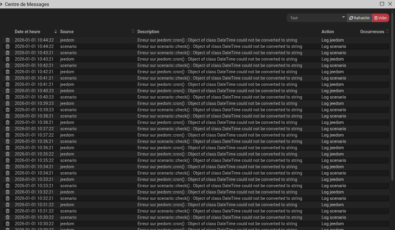 0010|[2026-01-01 10:33:21][ERROR] : Erreur sur jeedom::cron() : Object of class DateTime could not be converted to string
