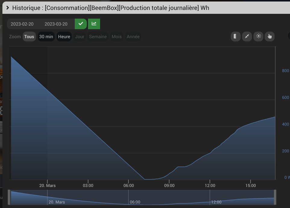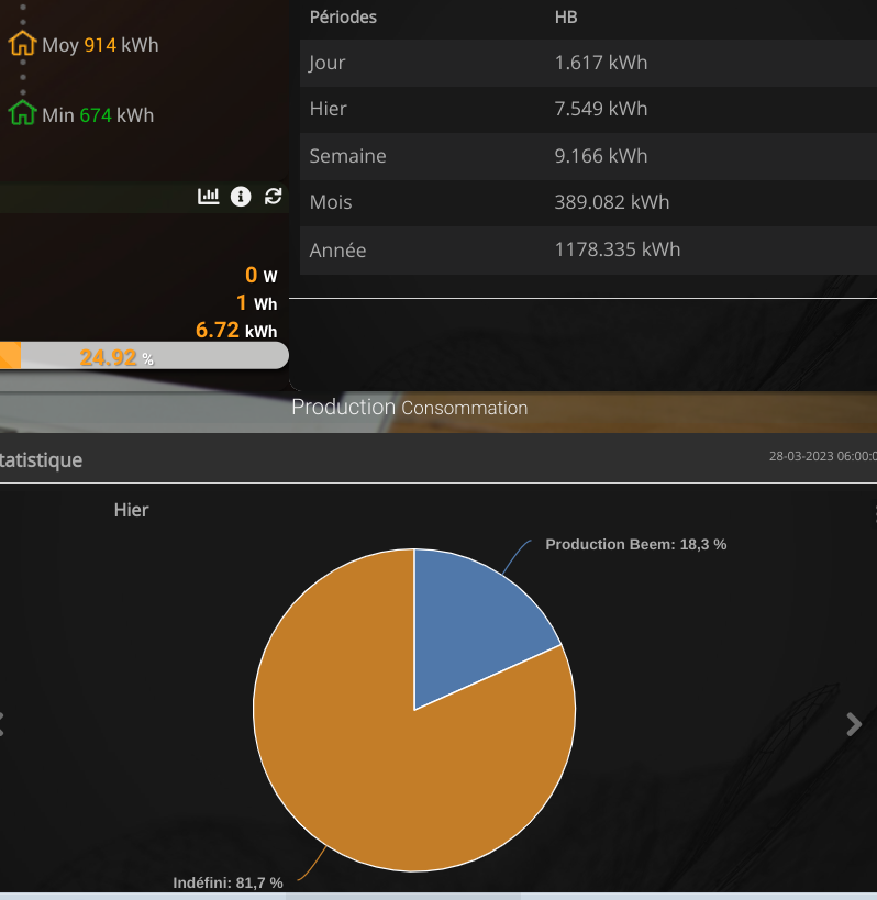 Dans suivi conso le total c’est la mesure de ton Lixee. Donc si tu as moins de conso ton total sera minoré. Mais du coup tu n’as pas une représentation correcte de la part d’autoconsommation. Pour cela, il faut pouvoir mesurer la conso total de la maison: que la source soit le réseau EDF ou tes panneaux BEEM et donc mettre tes panneaux BEEM en enfant.