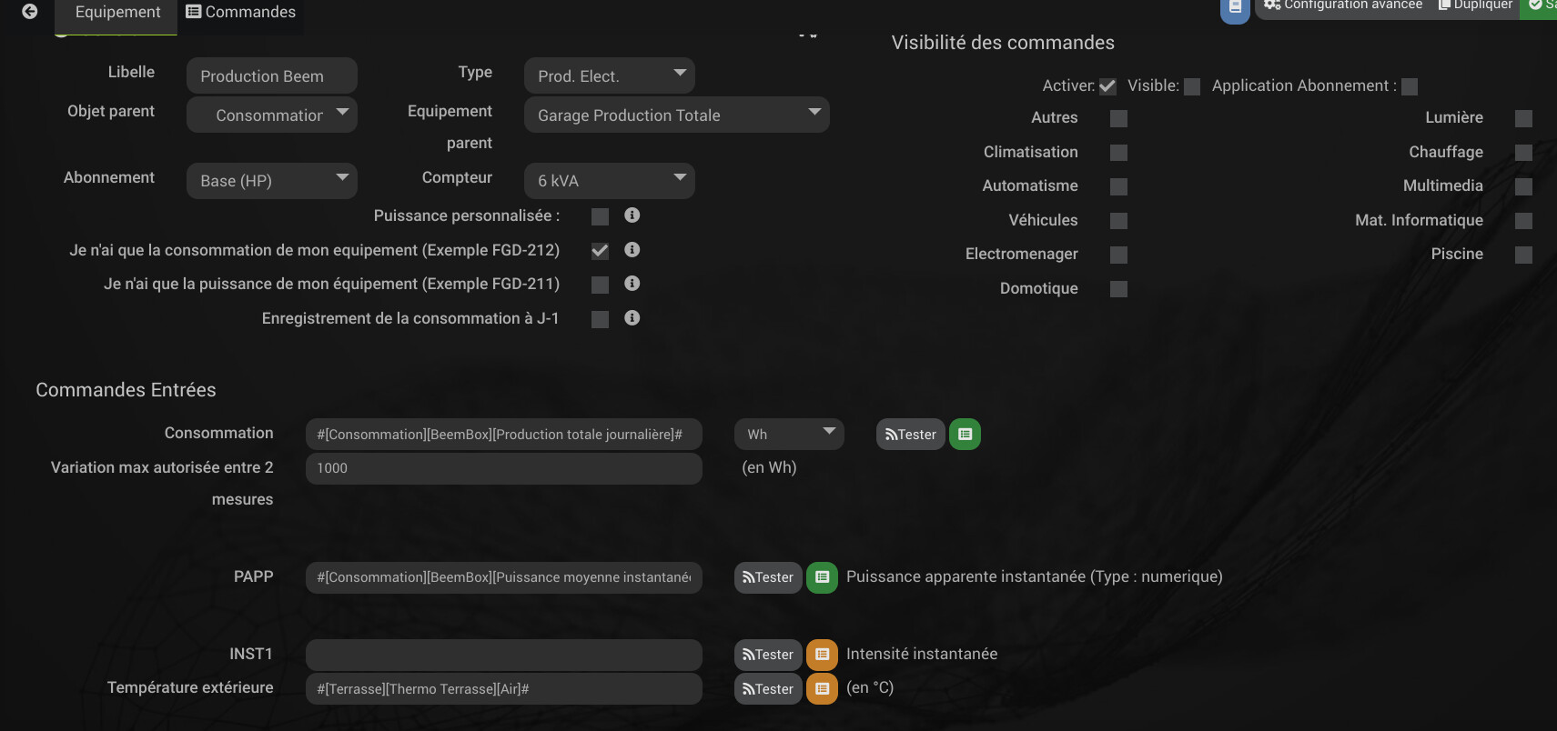 j’ai installé les panneaux solaire beem ce week end, je viens de tout intégrer dans jeedom, j’ai juste une question sur le paramétrage de mon équipement dans le plugin suivi conso :