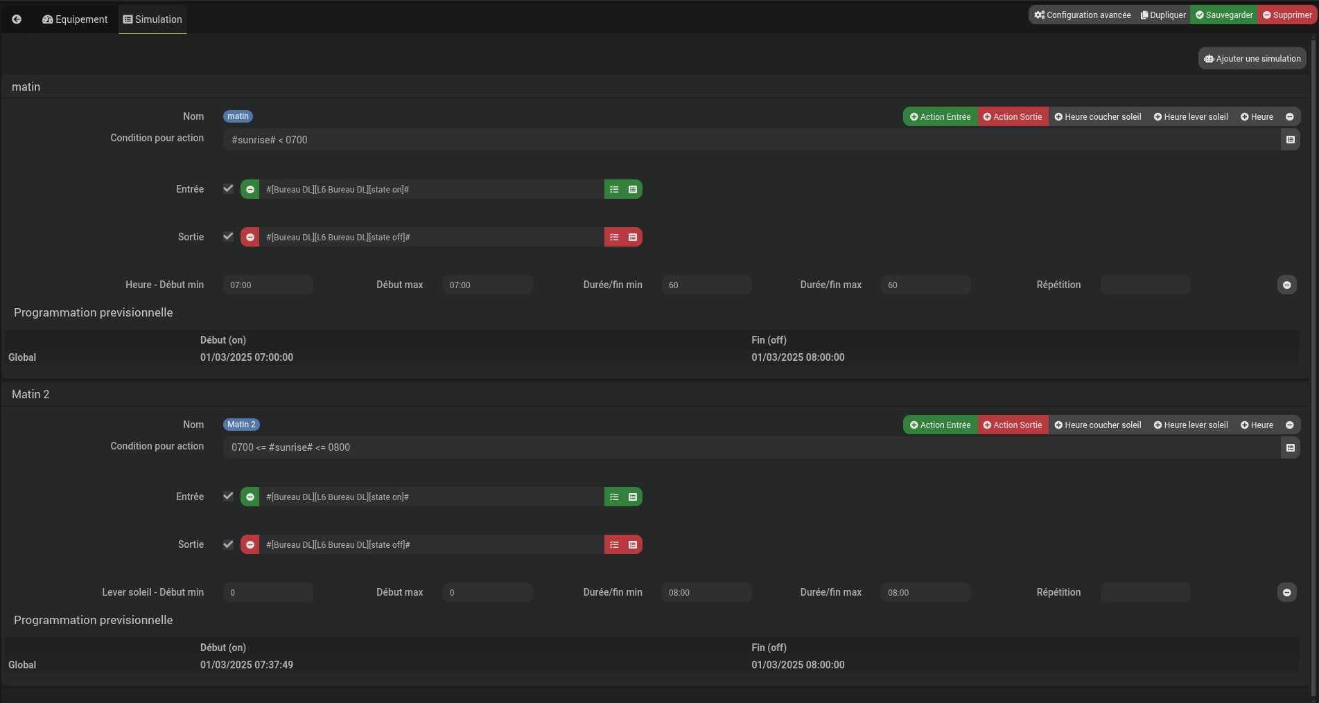 Je le mets en place. C’est cohérent. Par contre, là où je pensais mettre une seule simulation (avec ‘lever ‘et ‘coucher’), j’en mets 4 : 2 le matin (fixe et ‘lever’) et 2 le soir (fixe et ‘coucher’). Mais c’est jouable. L’avantage par rapport au scénario, ce sont les plages horaires où l’action peut démarrer et finir à une heure différente, ce qui est plus plausible qu’une heure fixe. Quoique…