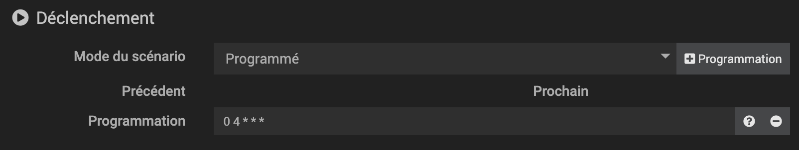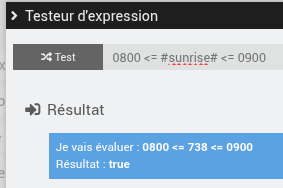 Où dans cet exemple, on aura une action x minutes avant (défini par le signe -) le lever de soleil, x étant compris aléatoirement entre 30 et 50 minutes.
