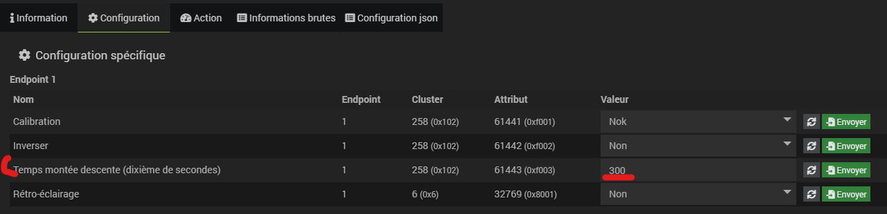 Dans le plugin zigbee je pouvais en allant dans configuration du module → configuration, régler le temps pour la montée/descente